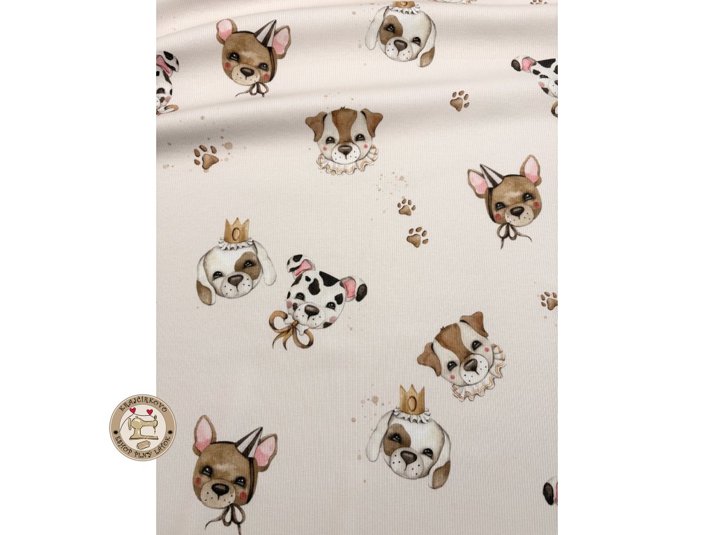 Žebrovaný úplet - Královští psi je skvělou volbou pro každého, kdo hledá kvalitní, měkkou a hravou látku s krásným psím motivem. Vaše tvořené projekty budou pohodlné, stylové a jedinečné.
