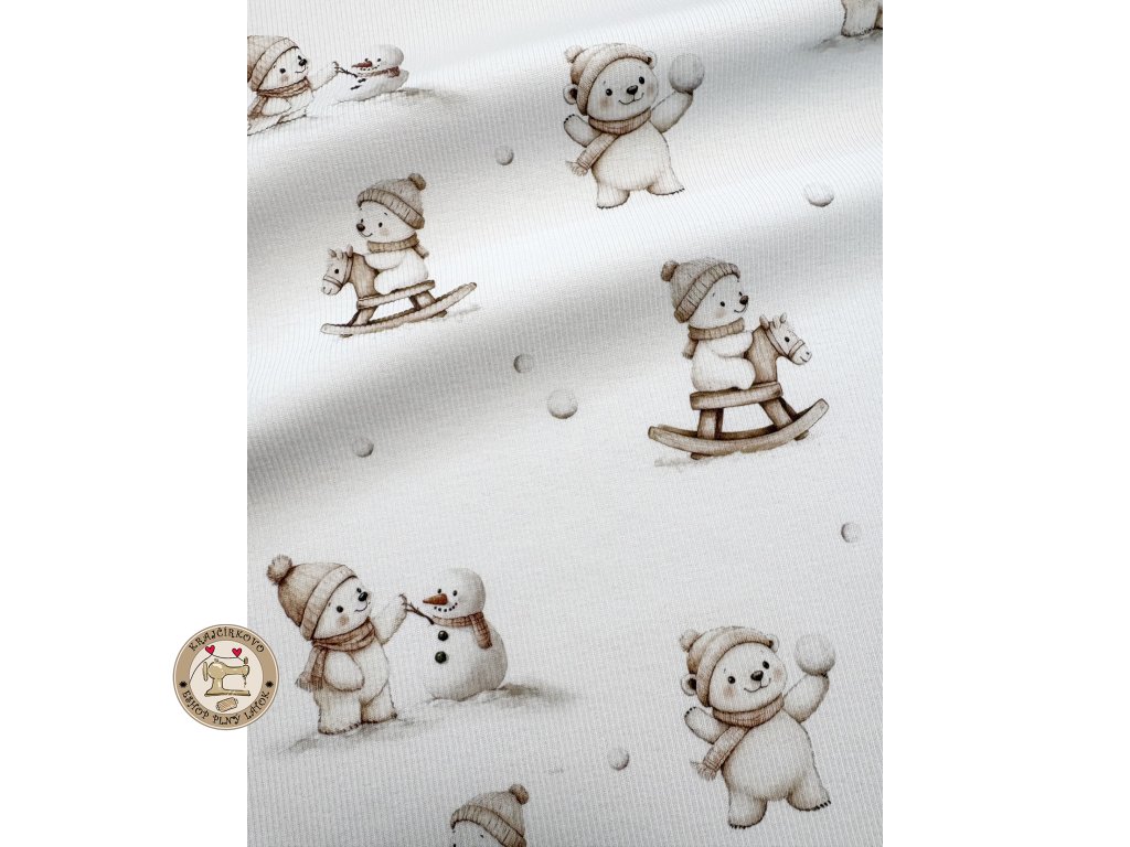 Žebrovaný úplet - Medvídek se sněhulákem a koníkem ve sněhu