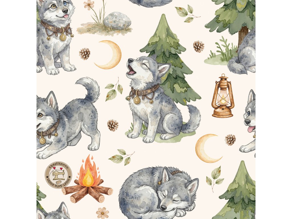 Pre malých objaviteľov, ktorí milujú les a zvieratká. Detský vzor s malými vlčiakmi v lese, doplnený o stromy, ohník a drobné detaily, ktoré vytvárajú hravú...