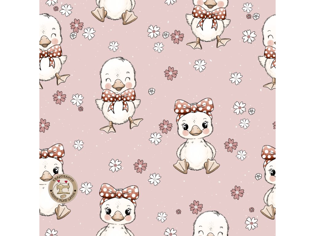 Hladký úplet s nežným vzorom husičiek v šatách, doplnený o kvietky, jahôdky a drobné záhradné detaily. Motív je tlačený reaktívnou potlačou - farba je súčasťou...