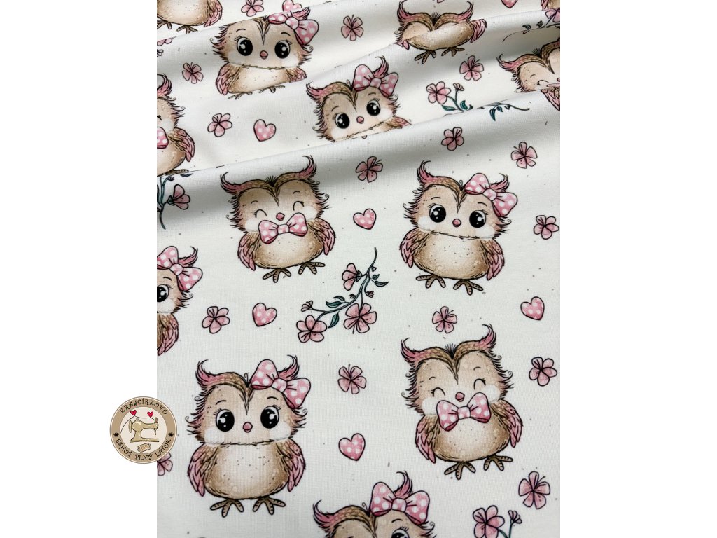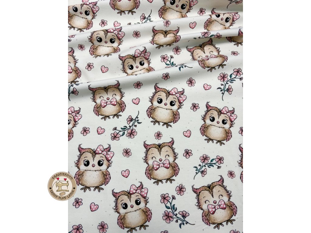 Príjemný rebrovaný úplet so sovičkami s mašličkami si zamilujete na prvý pohľad. Vzor je originál ručne maľovaný, plný jemných detailov, kvietkov a srdiečok v romantických...