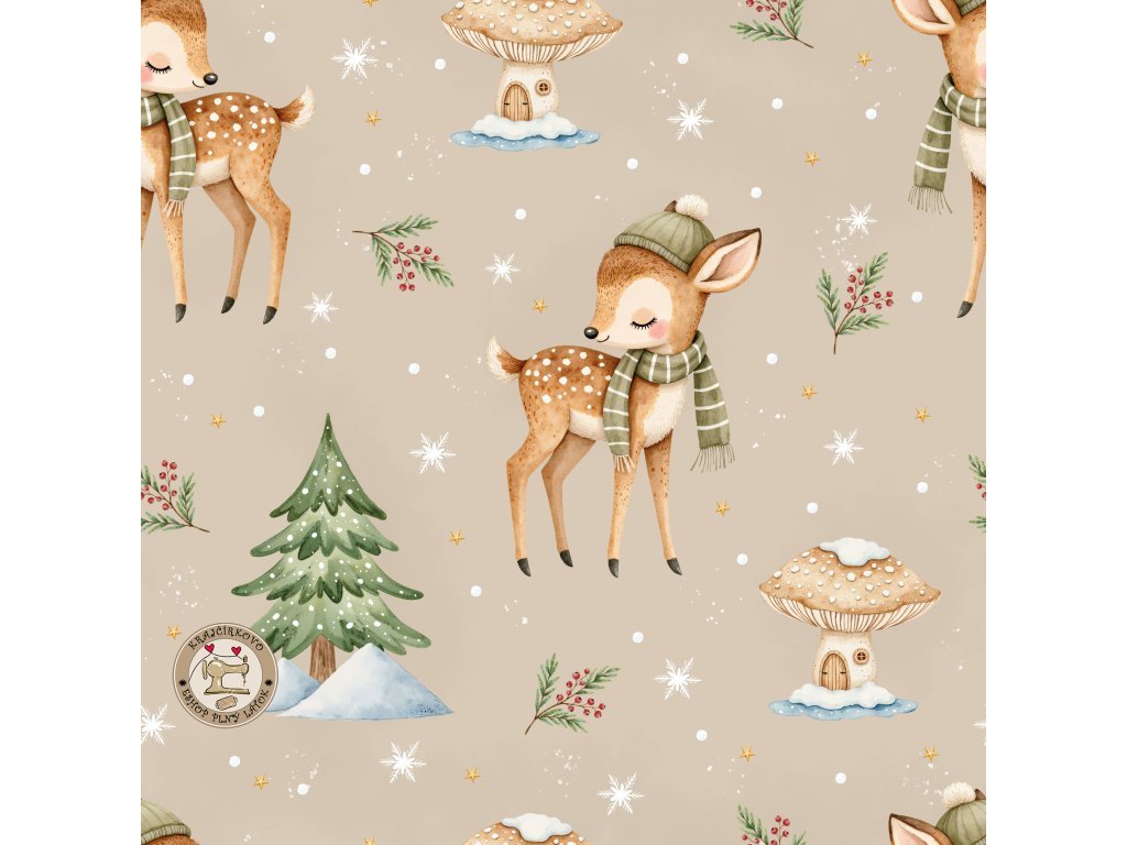 Látka Rebrovaný úplet - Srnka v zime je ako stvorená na šitie útulných kúskov pre chladné mesiace. Spojenie hrejivých tónov, zimných motívov a mäkkej textúry z nej robí ideálny materiál pre pohodlné, štýlové a originálne handmade oblečenie.