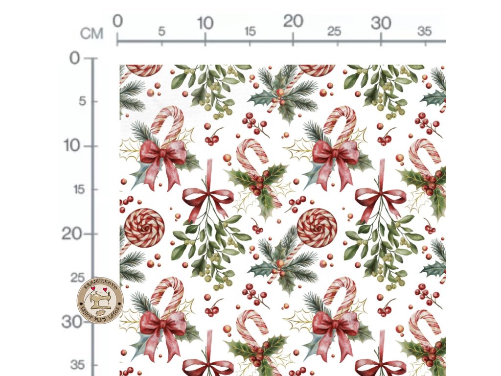 Látka Rebrovaný úplet - Vianočné vetvičky a mašle je dokonalou voľbou pre všetkých, ktorí chcú do svojich handmade projektov vniesť sviatočnú pohodu, eleganciu a štipku nostalgie. Z nej ušité kúsky budú žiariť čarom Vianoc po celú zimu.
