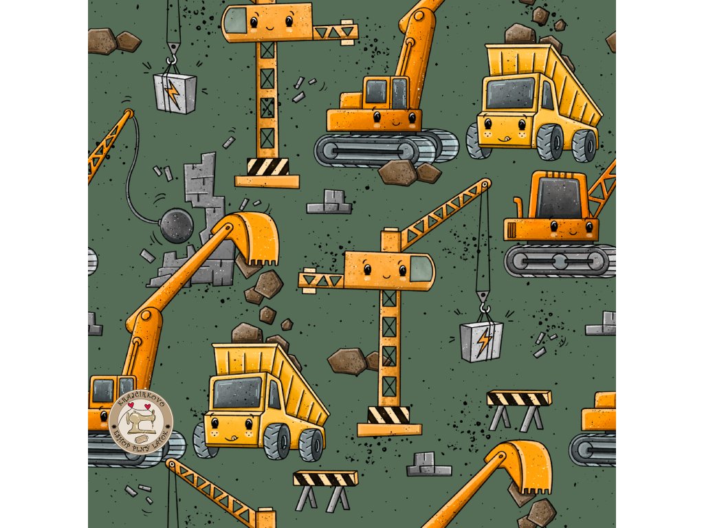 Vzorovaná teplákovina - DINO Bager. Tento autorský vzor látky, ktorý je exkluzívne v ponuke len u nás, zobrazuje zábavné dinosaury a bagre v akcii. Ideálny pre chlapcov , ktorí...