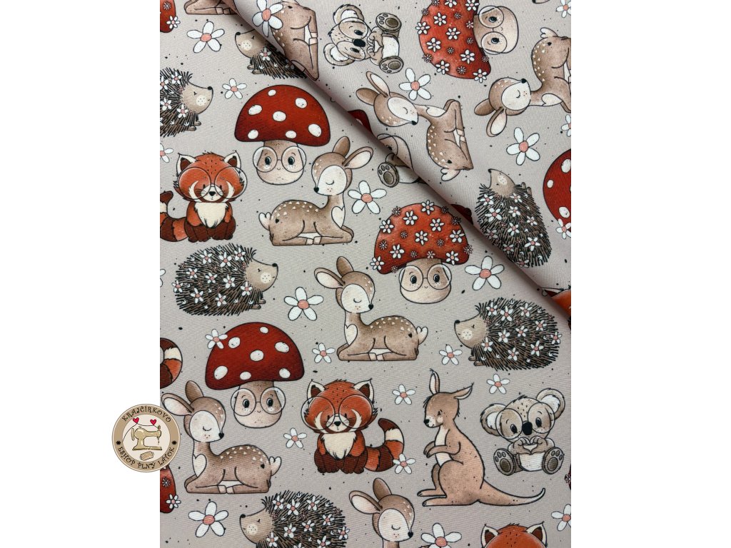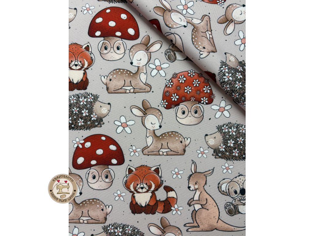 Vzorovaný rebrovaný úplet. Rozprávková jesenná látka plná milých kamarátov - ježka, srnky, koaly a samozrejme, muchotrávok. Hravý detský vzor stvorený na jesenné kúsky. ...